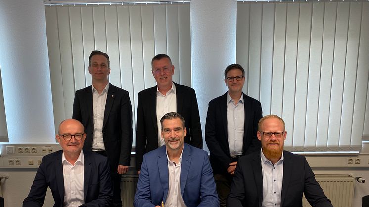 Freuten sich über den erfolgreichen Abschluss: (erste Reihe v. l.) Andreas Speith, Geschäftsführer Westfalen Weser, Bürgermeister Christian Belke, Matthias Bieler, Geschäftsführer Stadtwerke Holzminden und (zweite Reihe v. l.) Stadtwerke-Geschäftsführer Thorsten Welling sowie Rüdiger Hölscher und Marcus Hustadt von Westfalen Weser.